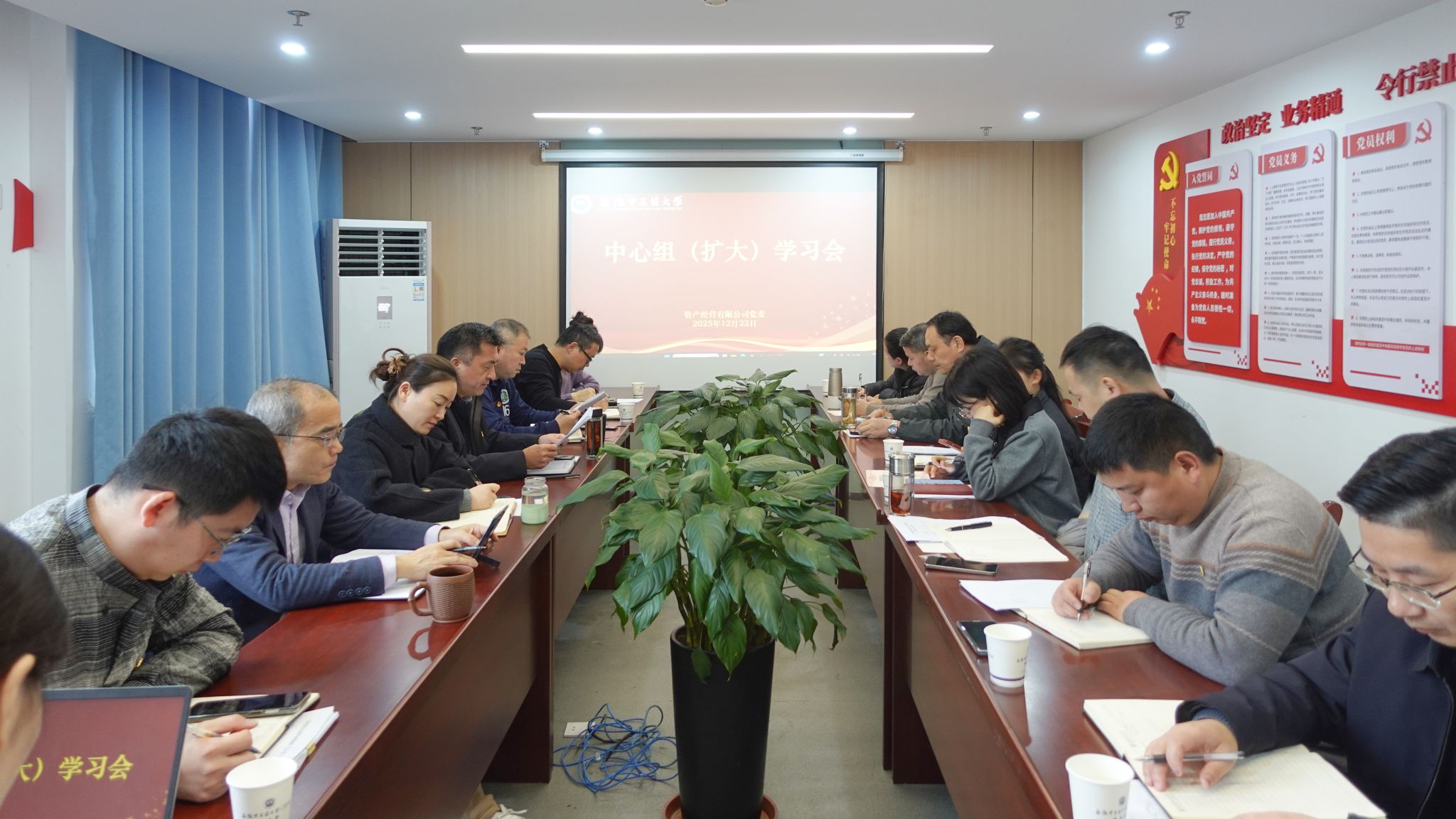 12月22日上午,资产公司召开12月党委理论学习中心组(扩大)学习会,本次学习主题为“学习贯彻习近平法治思想 推进公司合法合规经营发展”。公司党委委员、副总经理、党支部书记,以及党群部、综合办、战管部负责人参加会议。会议由公司党委书记、董事长孙道礼主持。