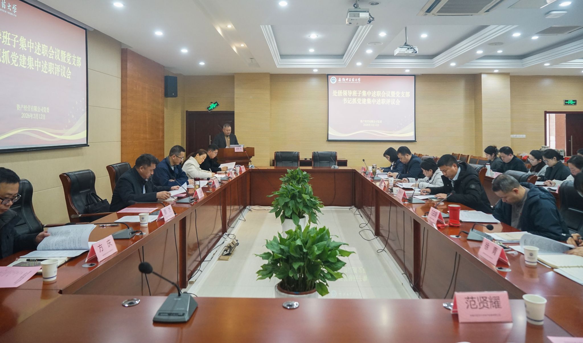 3月12日,安徽中医药大学资产经营有限公司召开2025年度处级领导班子集中述职会议暨党支部书记抓党建集中述职评议会,全面复盘年度工作成效、深刻查摆短板不足、明晰后续发展思路,切实压紧压实管党治党政治责任和经营管理主体责任,以述职评议促整改、促提升、促落实。学校党委组织部副部长任亚硕列席指导,公司处级领导班子成员、党委委员、纪委委员、各党支部书记、副总经理、各职能部门及所属实体主要负责人、党员代表参加会议,会议由公司党委书记、董事长孙道礼主持。