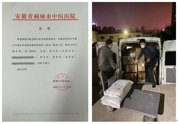 2月11日晚,在接到桐城市中医医院疫情防控药品库存告急的电话后,公司立即启动24小时应急防疫药品供应保障机制。在公司领导的统一调度指挥下,各部门分工协作,全力以赴,销售部落实人员和车辆进、出城的防疫证明文件,质管部开通防疫药品绿色通道,储运部安排专人发货配送,各部门立刻响应,各司其职,连夜将防疫药品第一时间迅速、安全送达。