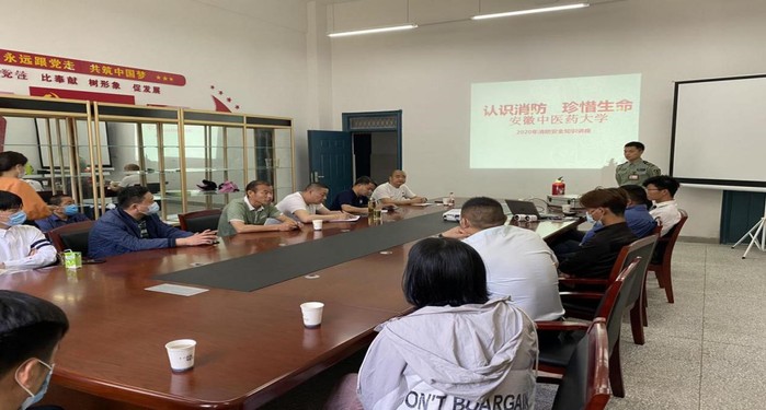 2020年5月18日上午9点,安徽中医药大学消防安全知识讲座在少荃湖校区资产经营总公司一楼会议室召开,此次讲座由保卫处消防科主办,安徽省众安防火中心李教官担任主讲,物业部门及少荃湖校区所有承租户参加了此次讲座。