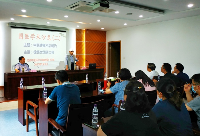 为进一步挖掘整理中医药学术思想精华,推进中医药学术经验传承创新,彰显中医药诊疗特色优势,促进我校中医药事业健康快速发展。7月9日下午,安徽中医药大学国医堂举办了中医肿瘤术后调治中心揭牌暨第二期国医学术沙龙会。国医大师徐经世,全国名老中医、省国医名师张杰,资产经营总公司总经理、国医堂门诊部主任张亚辉及高级顾问李瑞州,安徽省“西学中”学员、国医堂及大学中青年专家、县市中医院基层中医师、中医爱好者等共60余人参加了本次活动。沙龙会由张杰教授主持。