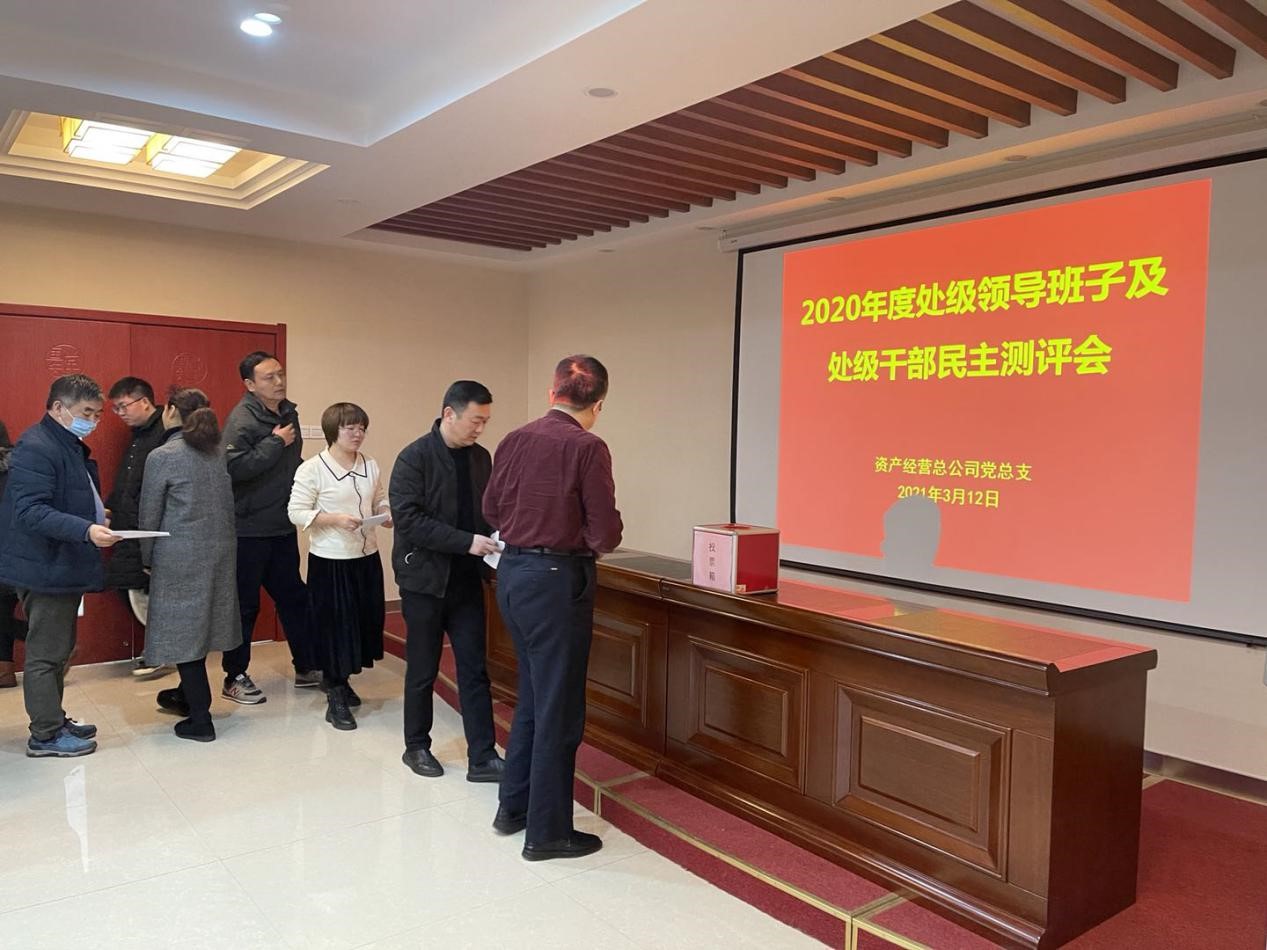 按照学校党委统一安排部署,资产经营总公司党总支于3月12日下午在花园街国医堂三楼会议室,召开2020年度处级领导班子及处级干部民主测评会。学校组织部综合科科长宋婷婷、总公司党总支委员、支部书记和委员、工会主席、共青团书记、资产经营公司中层干部20余人参加了会议。会议由党总支书记张亚辉主持。