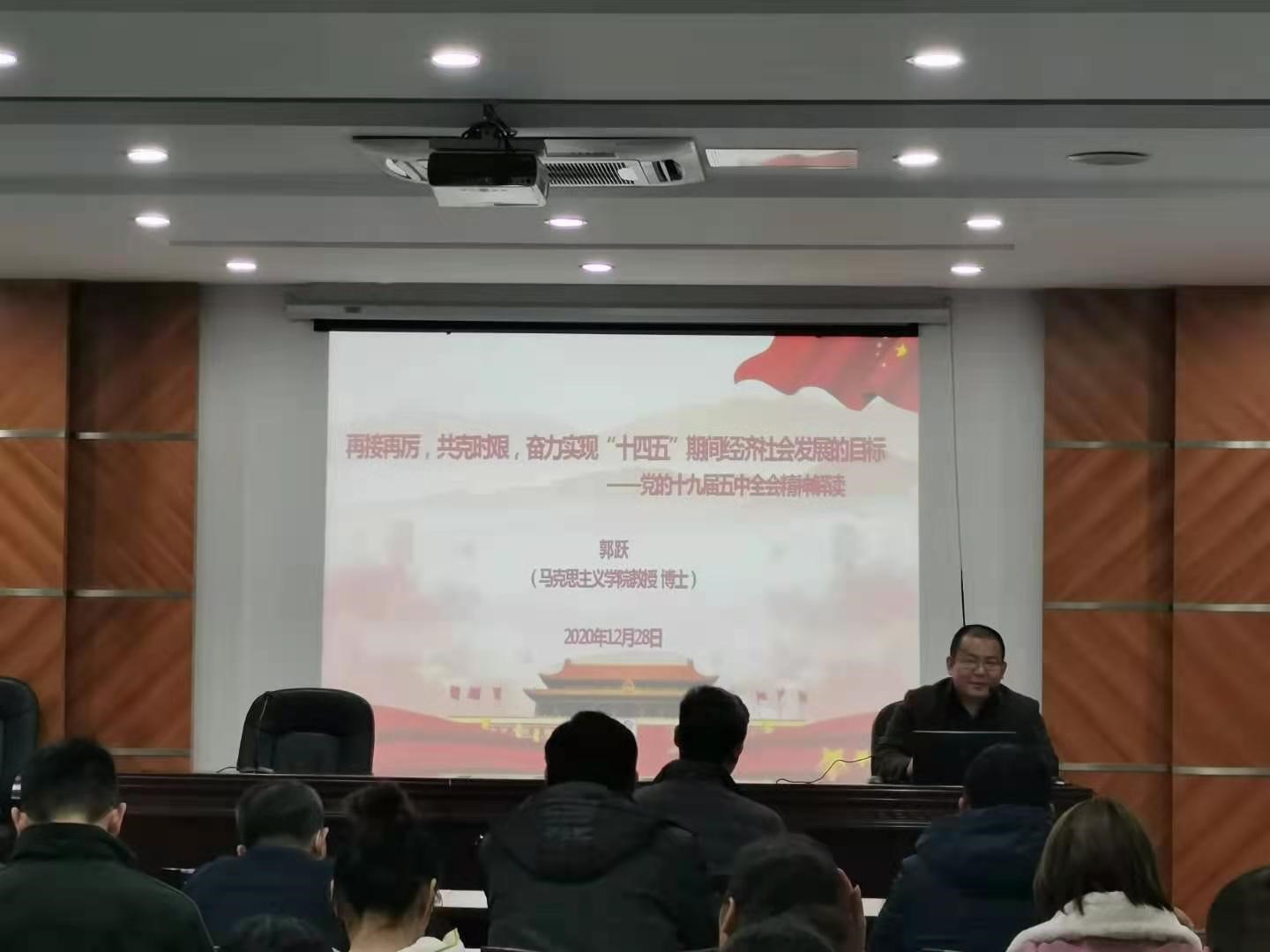学习会上,郭跃教授首先介绍了党的十九届五中全会的召开背景,从“主要成果”、“起草情况”、“突出特点、突出重点、突出亮点”、从“逻辑主线”、“《建议》、《公报》内容要点”、“核心要义”和“坚持党的全面领导”等方面详细阐述了党的十九届五中全会精神。郭跃指出,党的十九届五中全会精神深刻指明了今后一个时期我国发展的指导方针、目标任务、战略举措,充分体现了以习近平同志为核心的党中央谋划未来的远见卓识和继往开来的历史担当。全党全国各族人民要把思想和行动统一到这次全会精神上来,同心同德,顽强奋斗,为全面建设社会主义现代化国家开好局、起好步。