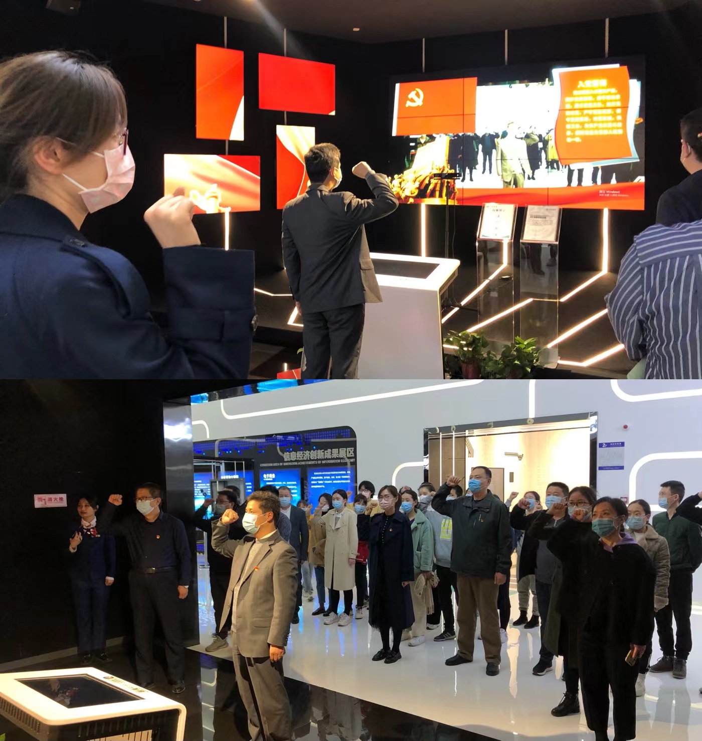 在创新馆二楼展厅前,张亚辉带领全体党员重温入党誓词,大家面向鲜红的党旗,高举右手,以铿锵有力的宣誓声,表达了全体同志对党的无限忠诚和“不忘初心、牢记使命”的坚定信念。他指出,我校校属企业体制改革不断推进,公司法人治理体系架构不断完善,依托着我校雄厚的办学实力和鲜明特色,资产公司承接着中医药事业和产业融合发展的光荣使命,任重道远。身居创新之城的合肥,更需要我们审视自身,明确定位,拉高标杆,积极向内涵式发展转型,更要强化创新意识和理念,多思多想多谋划,不能墨守成规,安于现状,提高自己的境界、胸怀和格局,不断从管理、服务和产品等三个方面进行创新,才能在创新为潮的时代背景下,拥有一席之地。