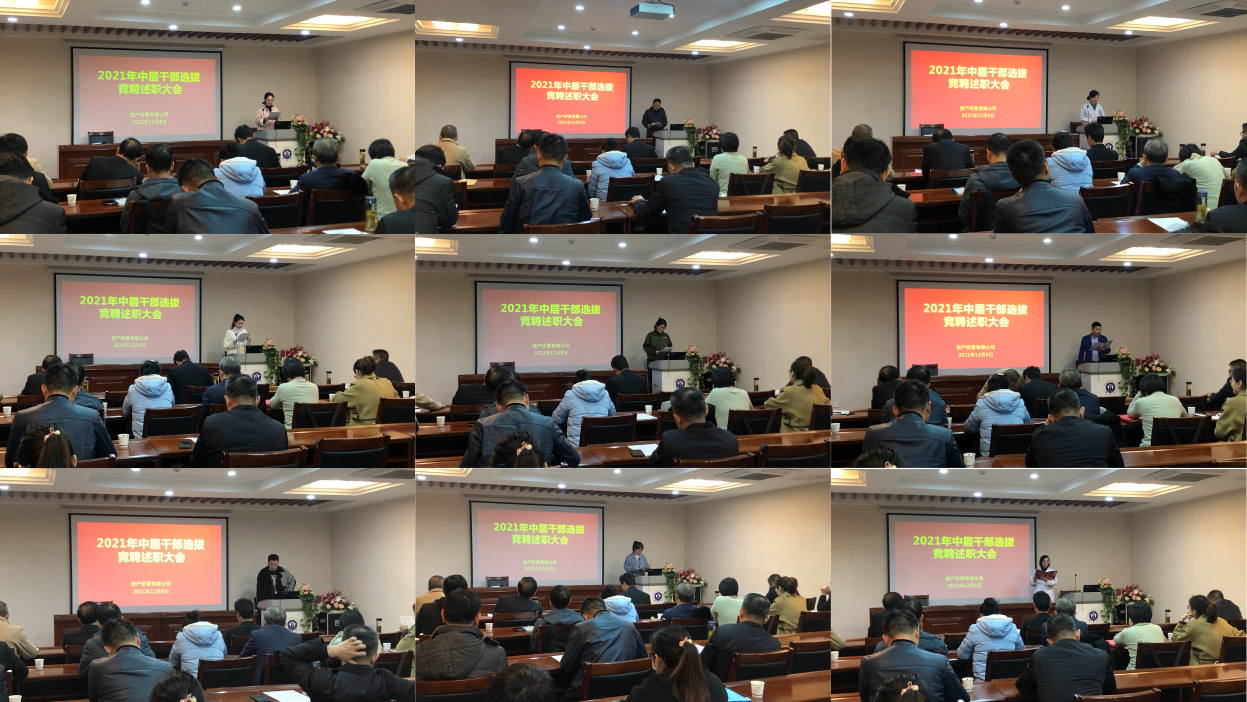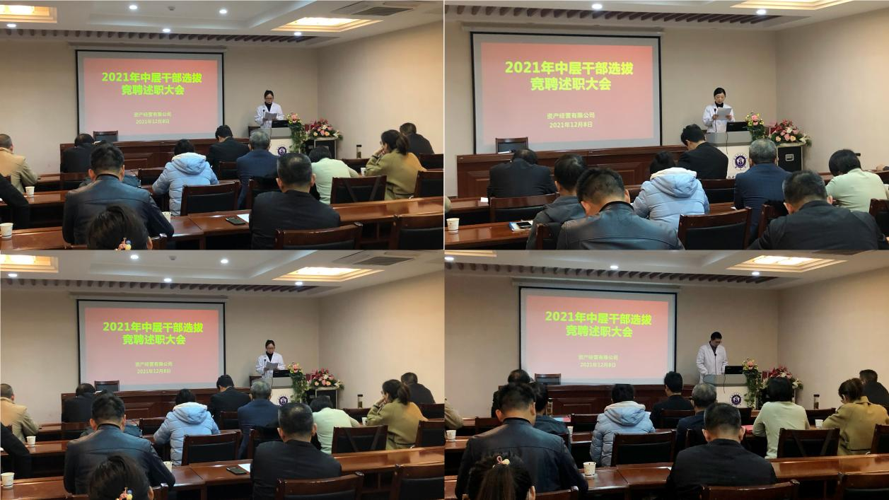为公司的健康可持续发展提供强有力的组织保障,建立科学选人用人机制,资产经营有限公司于12月8日下午在花园街国医堂三楼会议室,举行2021年中层干部选拔竞聘述职大会。资产经营有限公司党总支委员、领导班子成员及各实体中层干部、竞聘述职人员共计30余人参加了会议。会议由公司总经理蔡杰主持。