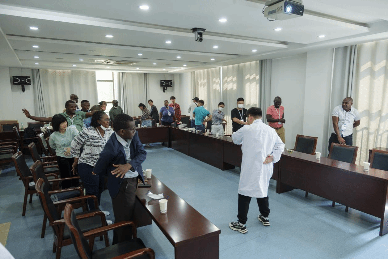 研修班成员在国医堂工作人员的带领下,参观了合作化路国医堂的中药房、内科诊室、推拿诊室等,通过和在场医务人员的交流和讨论,深入了解把脉问诊、针灸治疗、中药熬制等过程。随后,来自国医堂的万四妹教授使用全英文授课和现场实践互动的方式向大家介绍了中医及针灸的起源与应用,学员们在中药辩论、针灸体验、易筋经跟练等互动环节中不断加深对中医药的理解和认识。