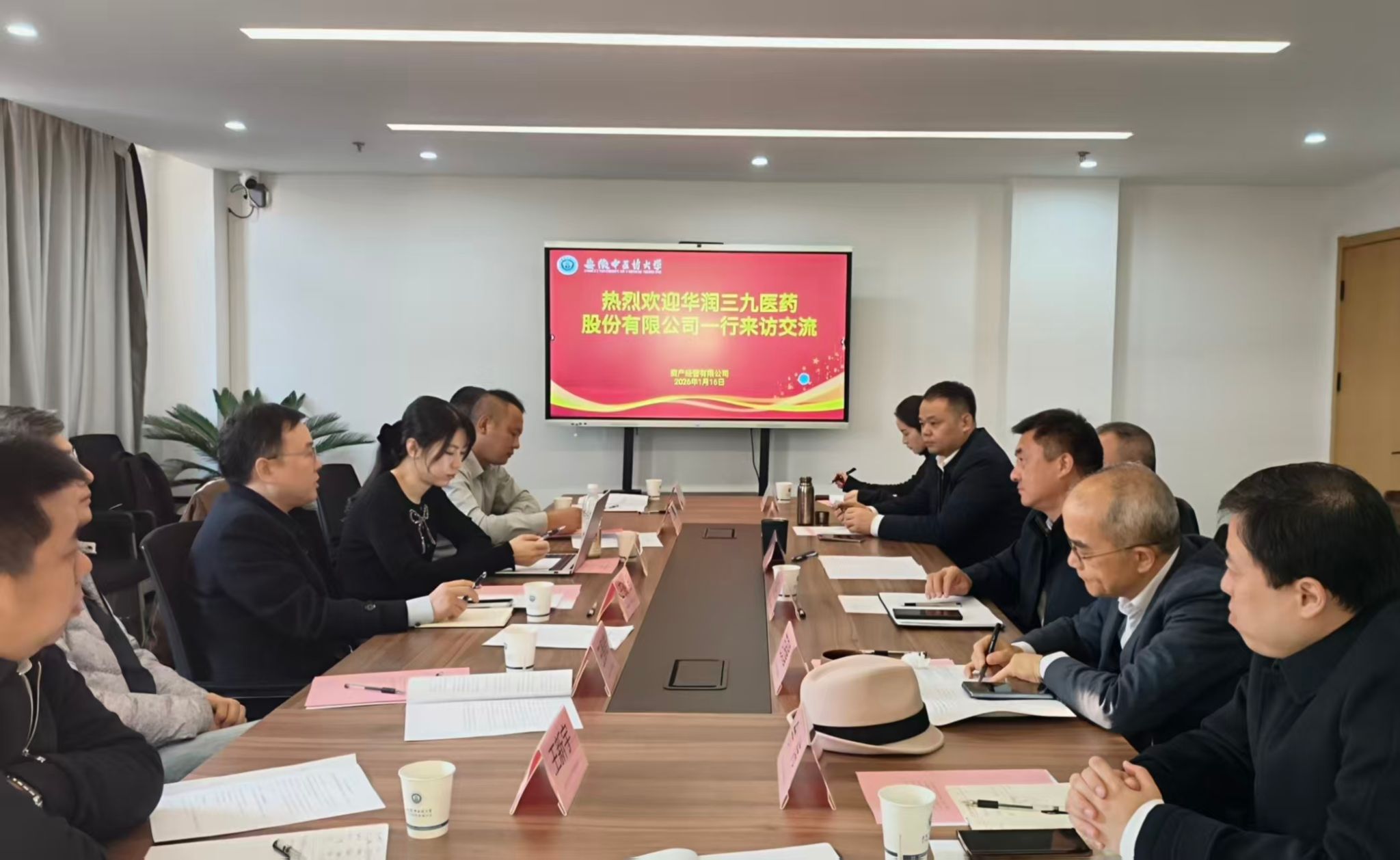 1月16日上午,华润三九医药股份有限公司国药事业部副总经理王俊浩一行到访资产经营有限公司。资产公司党委书记、董事长孙道礼,党委副书记、总经理蔡杰等参加座谈交流。