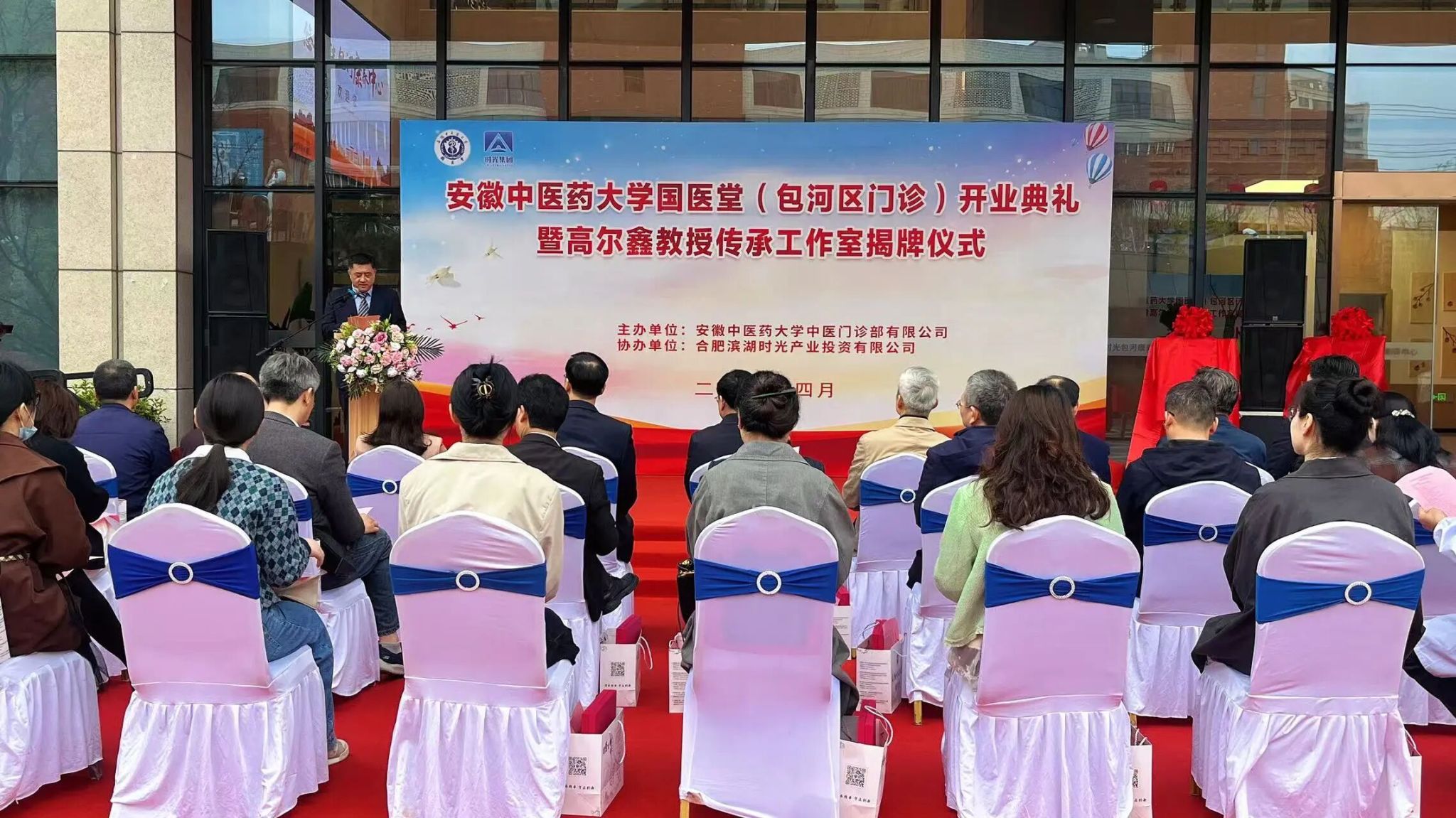 4月3日上午,安徽中医药大学包河区国医堂开业典礼隆重举行。学校党委书记谢瑞瑾,党委常委、副校长桂双英,安徽省健康文化旅游产业促进会会长高俊文,皖南医科大学原校长廖圣宝,安徽省中医药管理局二级调研员祝劲松,包河区委书记周天斌、副区长王振羽,包河区及区卫健委相关负责人,学校相关职能部门和二级院部负责人,中医药领域知名专家、媒体代表、医护代表及周边市民群众齐聚现场,共同见证这一重要时刻。开业典礼由学校资产经营有限公司党委书记、董事长孙道礼主持。